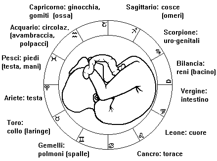 Ogni Segno dello zodiaco ha caratteristiche diverse l’uno dall’altro e, partendo dalla parte alta del corpo fino ai piedi, ha una corrispondenza con ogni sezione anatomica del corpo umano. Si parte con l’Ariete: la testa, il Toro: la gola e il collo, i Gemelli: polmoni e braccia, il Cancro: lo stomaco, il Leone: il cuore, la Vergine: l’intestino, la Bilancia: l’addome e i reni, lo Scorpione: l’ano e gli organi genitali, il Sagittario: le gambe, il Capricorno: le ginocchia e lo scheletro, l’Acquario: le caviglie e, infine, i Pesci: i piedi.